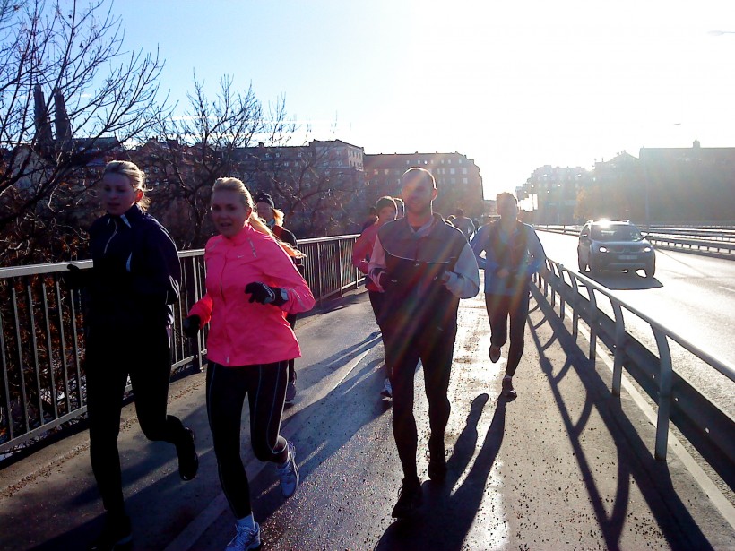Vi önskade varandra lycka till och skildes åt. Jag var i sista startgruppen och det blev lite väntan. Vädret var perfekt. Mulet, men ändå hyfsat varmt. Jag hade bestämt mig för att ta det lugnt och verkligen lyssna på kroppen. Alla skräckhistorier om hjärtsäcksinflammationer, hjärninfarkter och dylikt snurrade runt i huvudet på mig. Starten gick och jag tyckte nog att alla sprang iväg med väldig fart. Benen kändes förvånansvärt pigga - de hade visst längtat efter detta! Även andningen höll sig under kontroll och efter två kilometer började jag tänka att det nog skulle gå att genomföra. Den första milen var underbar löpning! Inte alltför trångt och väldigt välorganiserat. Jag passerade 10 km på 54 minuter. Vi fortsatte genom Riksdagshuset och vidare längs med Skeppsbron och här mötte vi de som redan sprungit runt Södermalm och var på upploppet. Jag spanade efter Mats, men trodde nog inte att han skulle vara så här himla snabb.